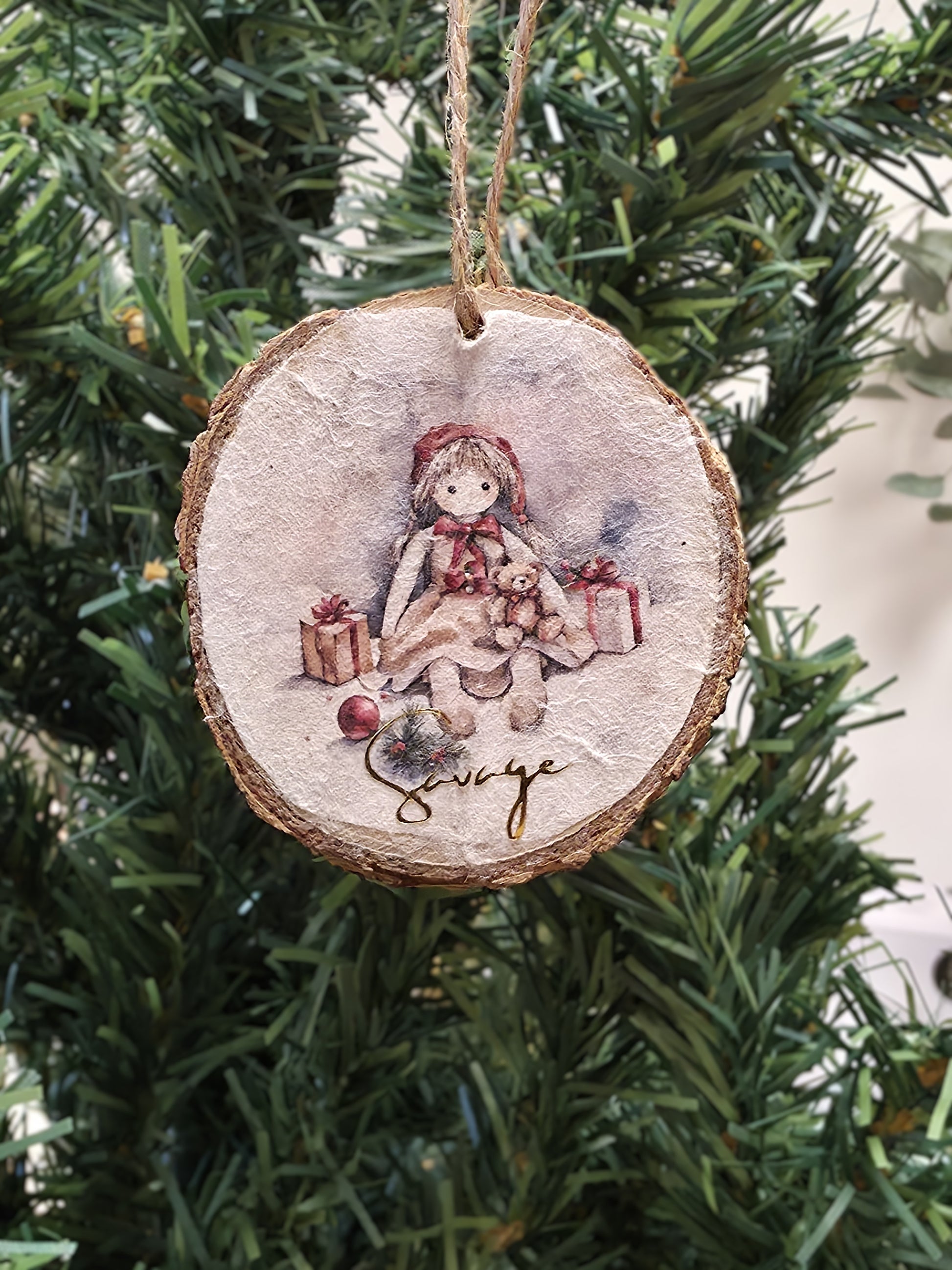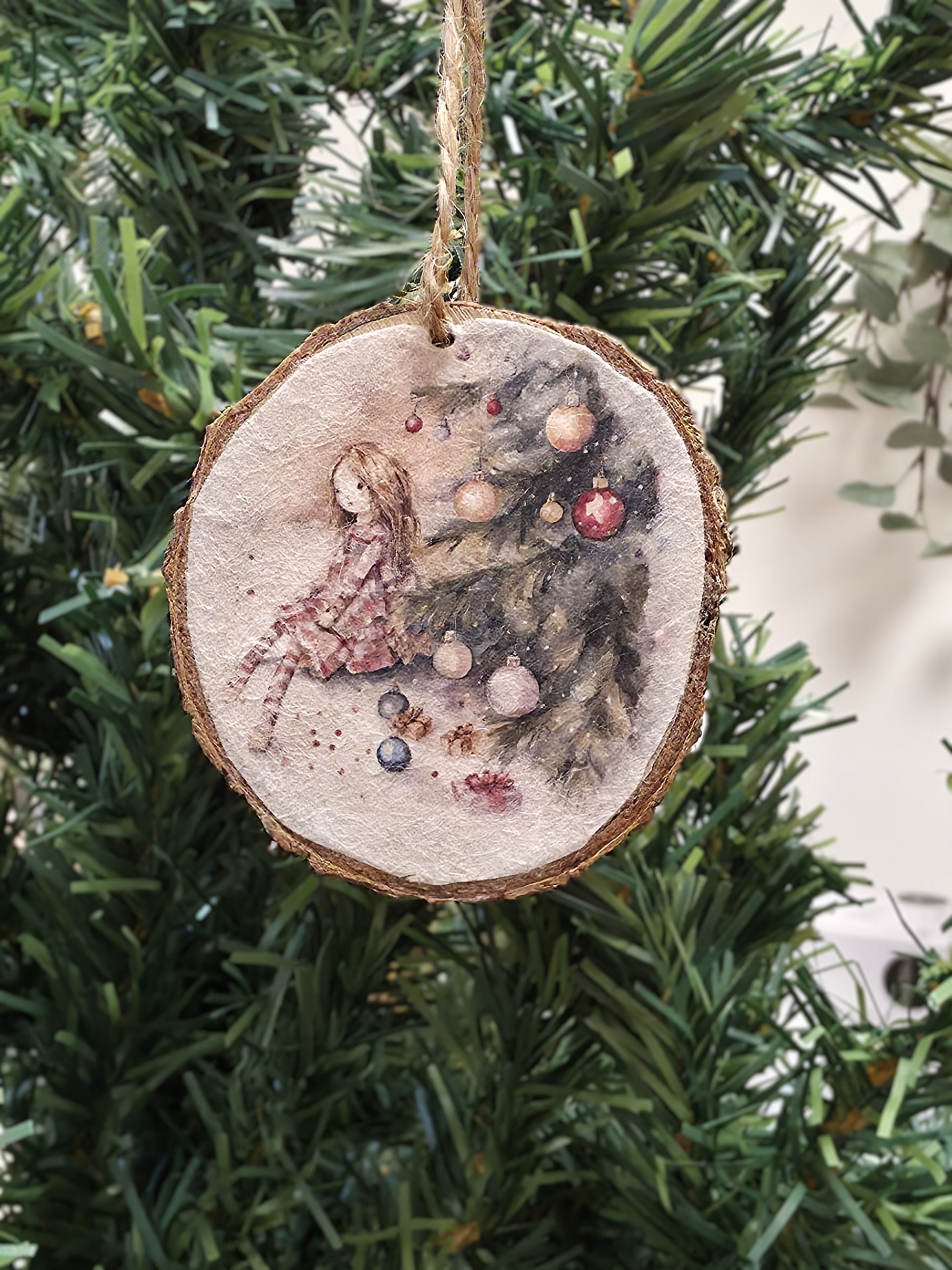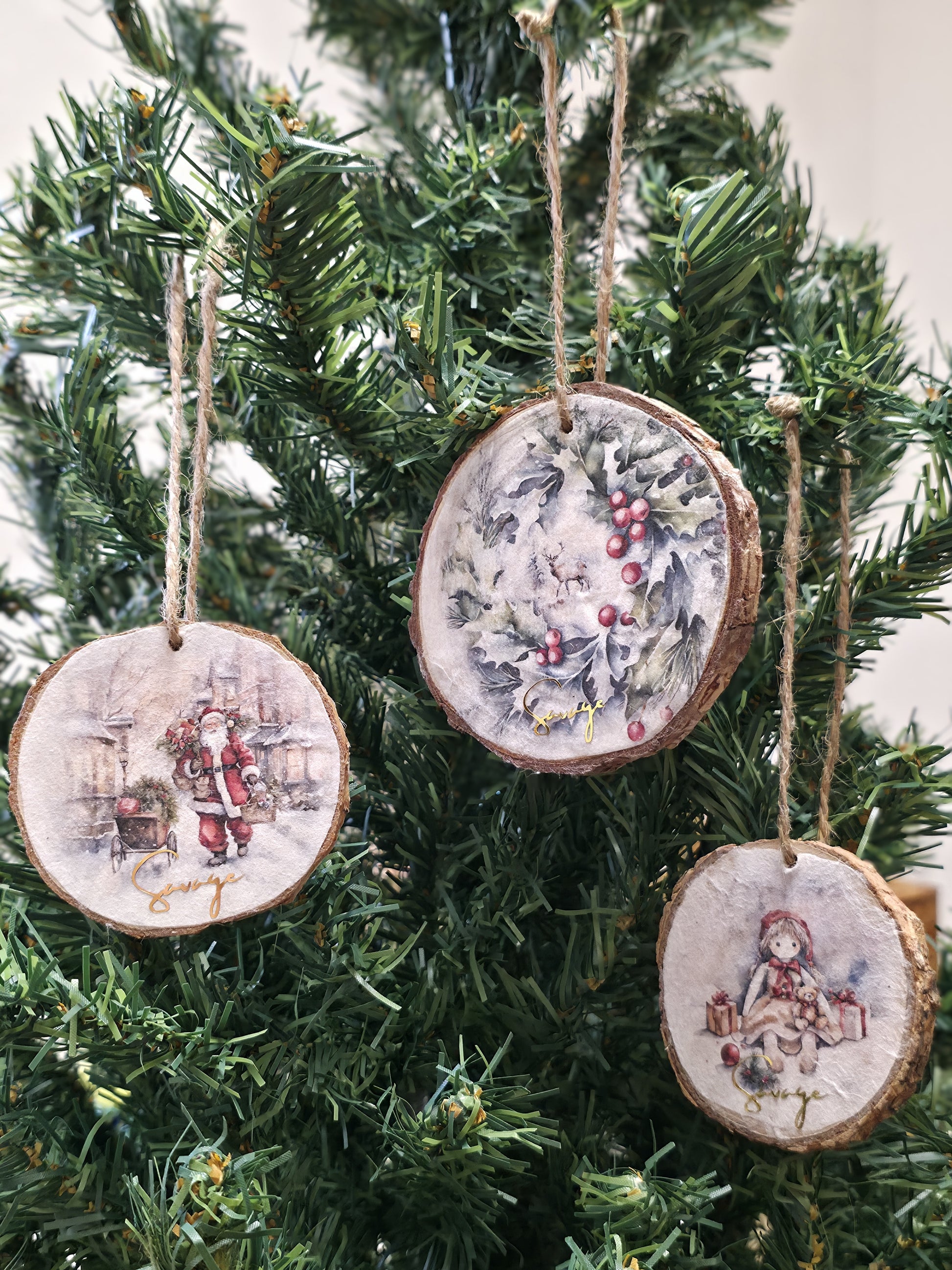 Nuestros adornos navideños están hechos a mano con rodajas de madera natural y decorados con ilustraciones vintage que llenan cualquier rincón de encanto y nostalgia.