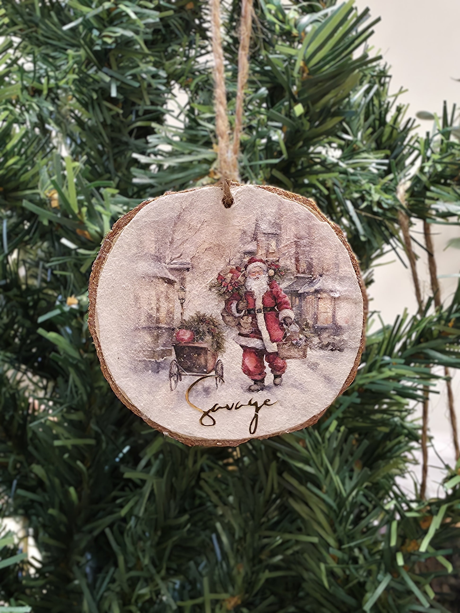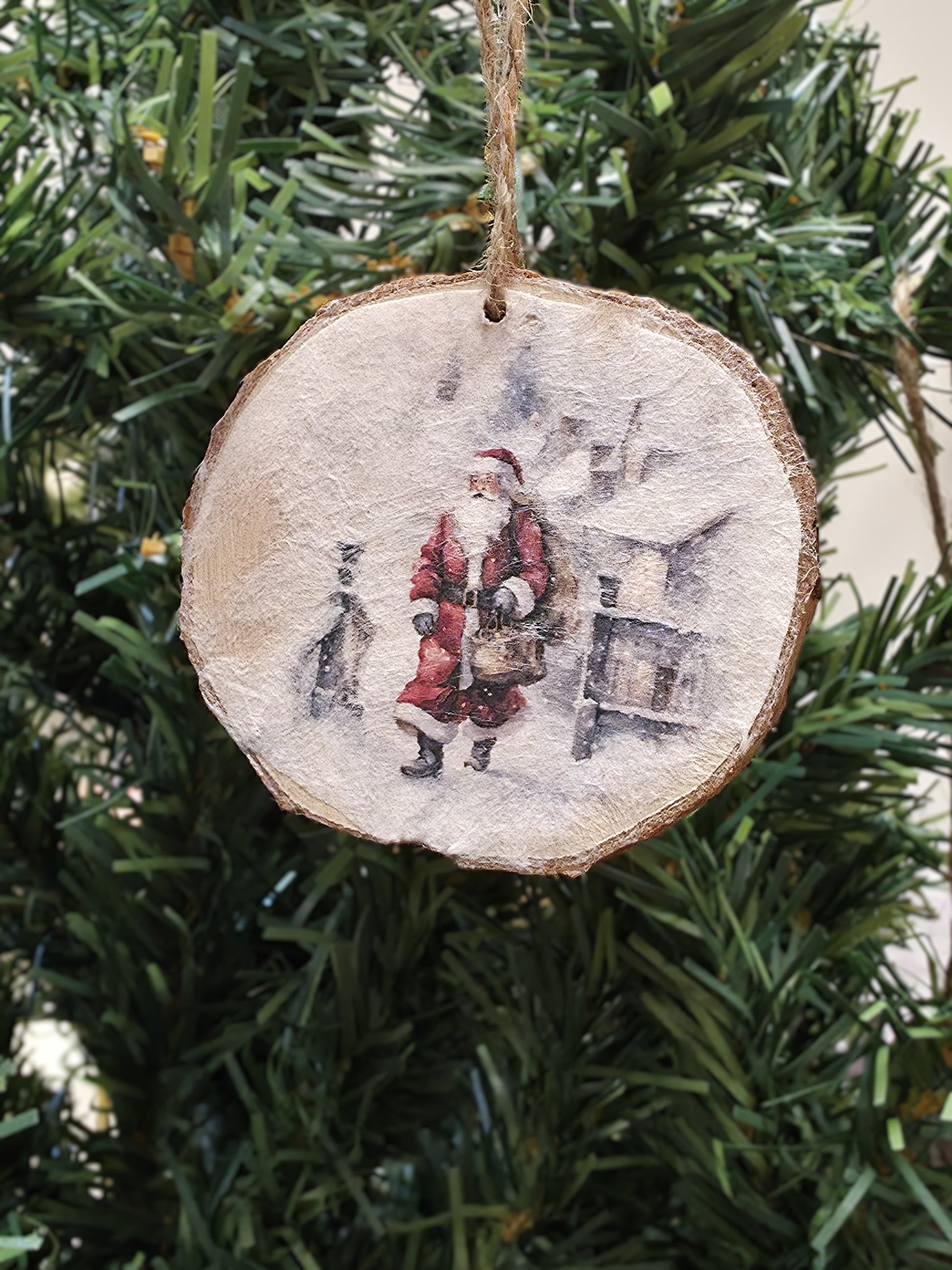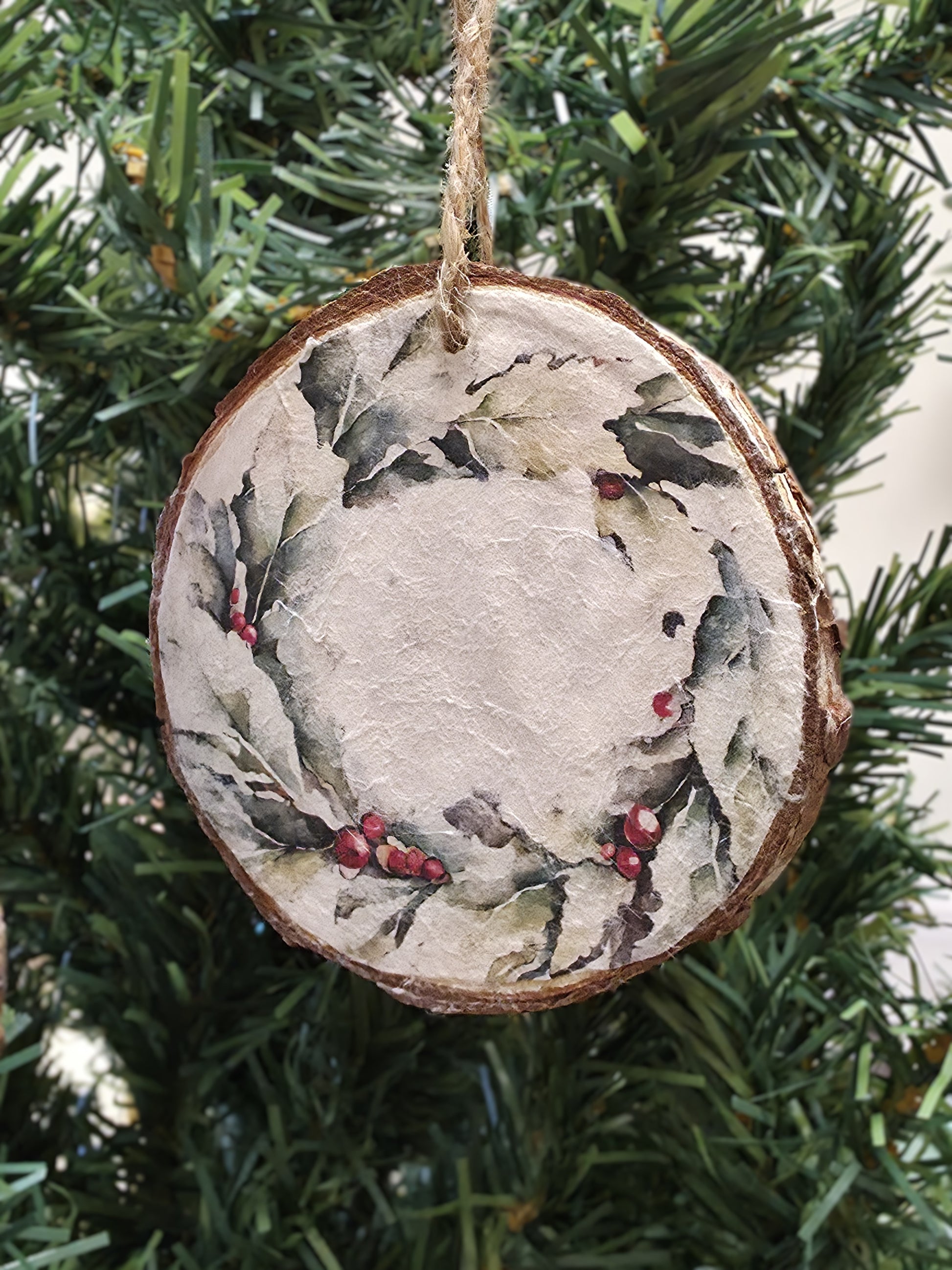 Nuestros adornos navideños están hechos a mano con rodajas de madera natural y decorados con ilustraciones vintage que llenan cualquier rincón de encanto y nostalgia.